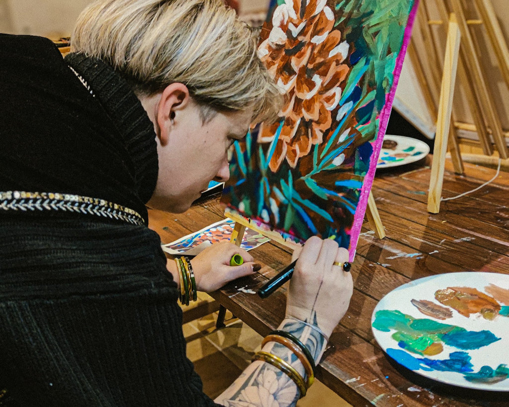 Après une présentation du sujet du jour, on attaque les premières couches de peinture ! Je vous guide étape par étape, en peignant à vos côtés, et je partage des astuces pour les mélanges de couleurs et les techniques. Un deuxième verre vous sera servi en cours de soirée pour accompagner votre progression.